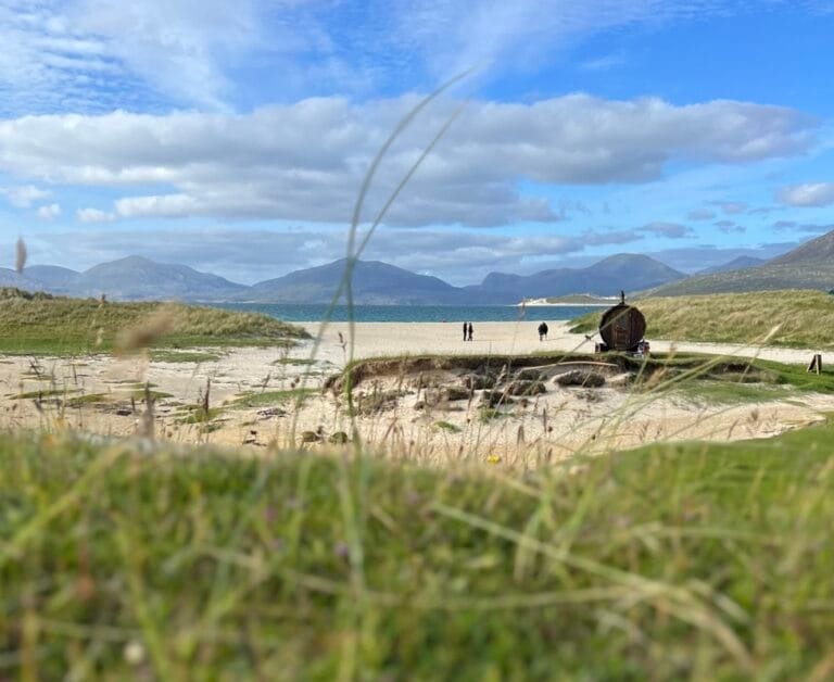 Shelly is our original sauna launched in October 2023 and holds a special place in our hearts. is made of alder wood and seats 4 people comfortably on a communal session or if you’re all friendly she can take a maximum of 6 people on an exclusive booking. You’ll often find Shelly at Horgabost Beach in Harris or at various weekend pop-ups around the Hebrides. Shelly has a ramp to access and a small porch for storage of water & towels. She has a large panoramic half-moon window that frames the views perfectly. Shelly holds a special place in our hearts as the first mobile outdoor commercial sauna to arrive in the Outer Hebrides and has supplied many islanders with great first outdoor sauna memories across many locations. You can book Shelly exclusively for £105 for up to 6 people (2025 prices).